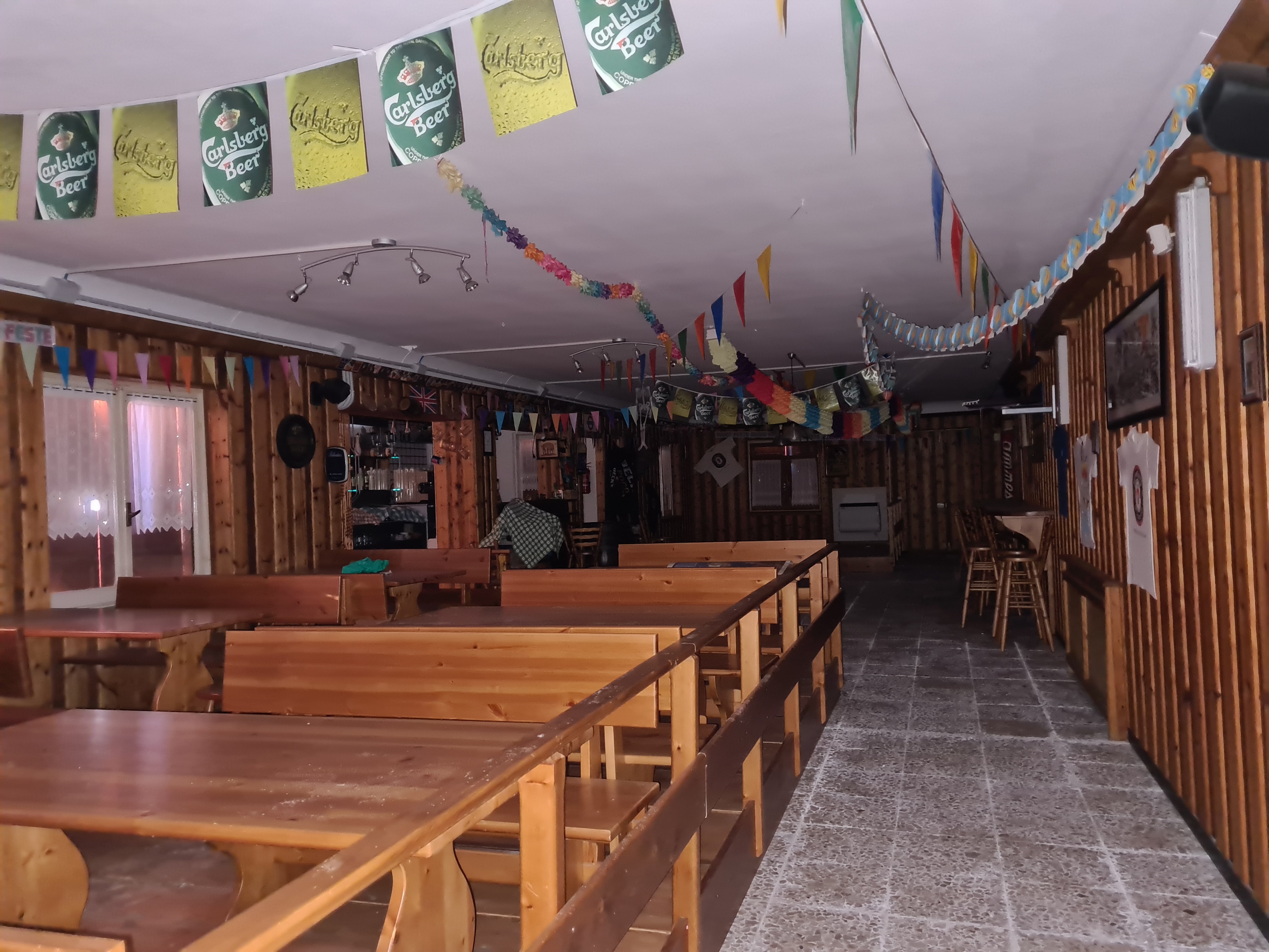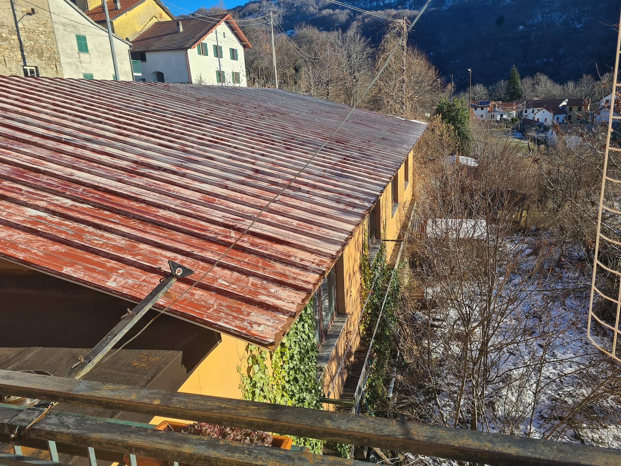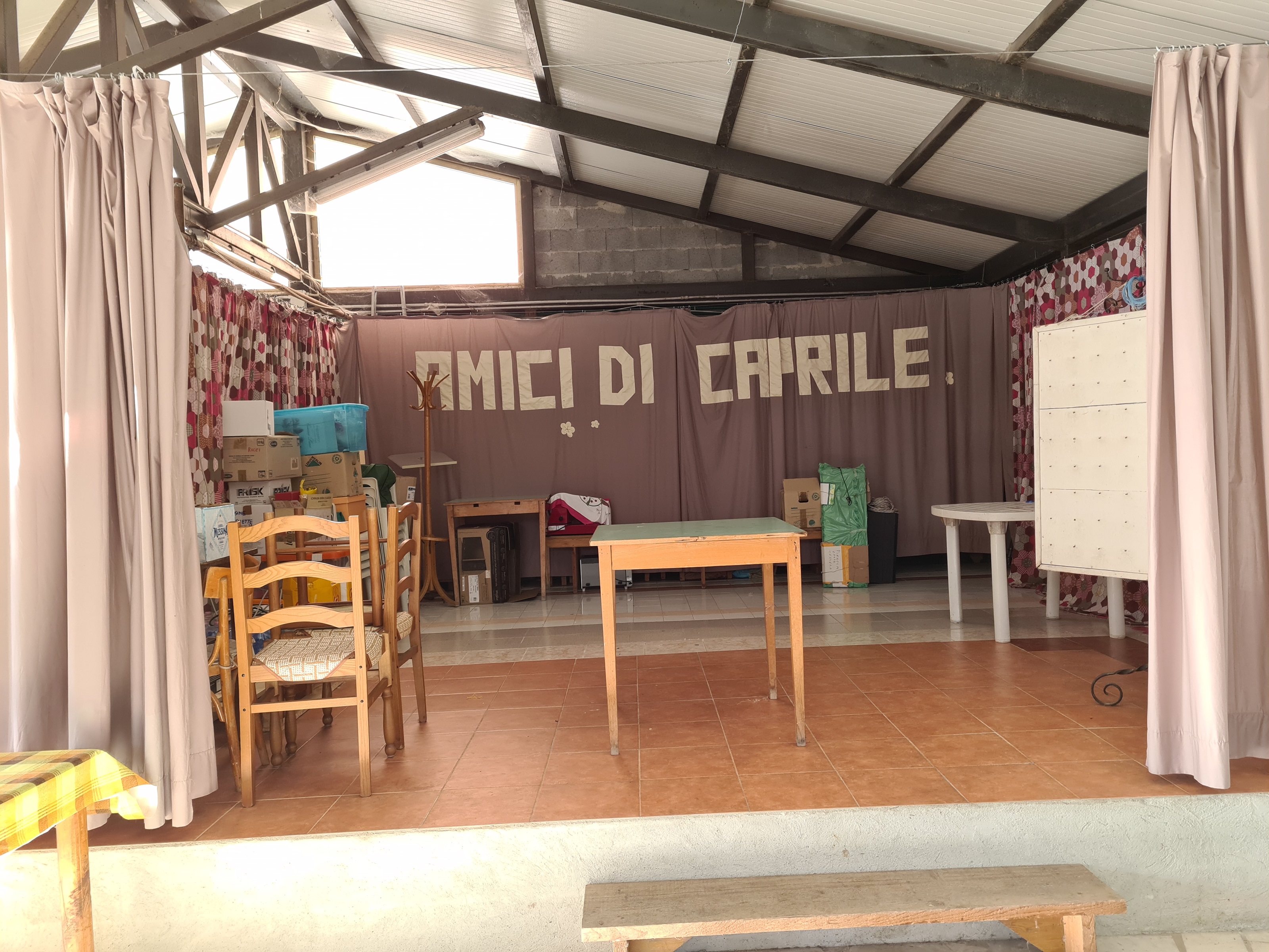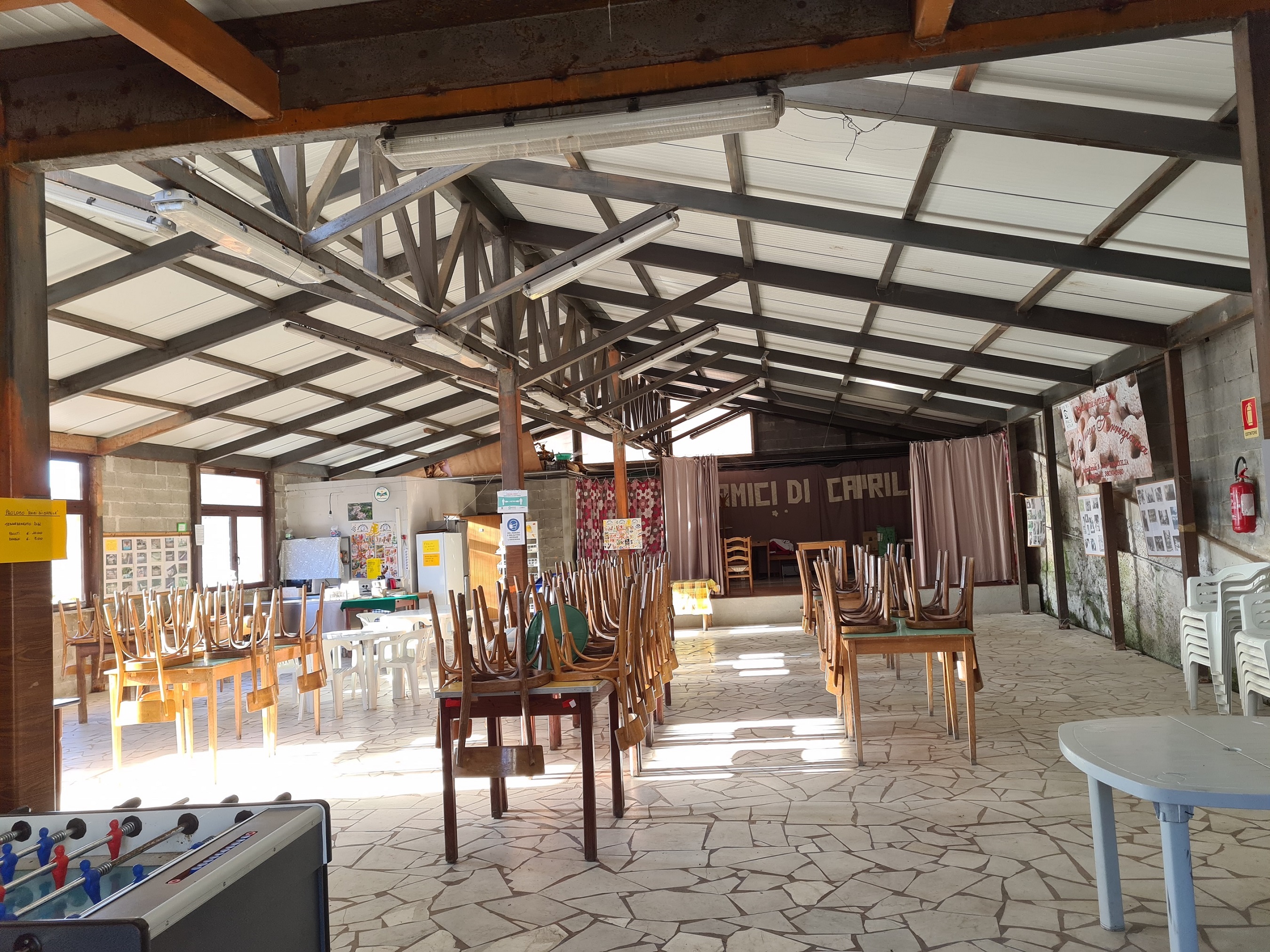 b) un corpo secondario su unico livello : grande capannone (300 mq. con h al colmo 4.35) utilizzato come salone per le feste ed eventi (dotato di servizi – lavanderia – cucinotto)