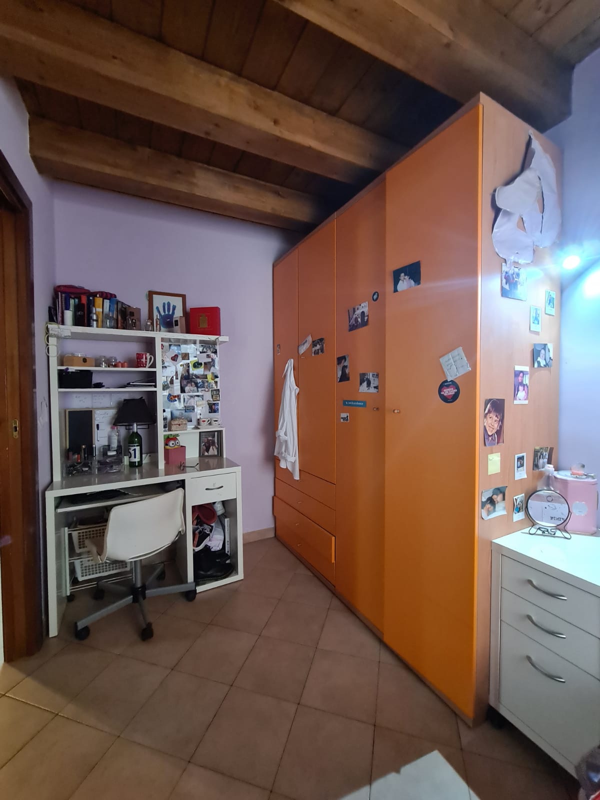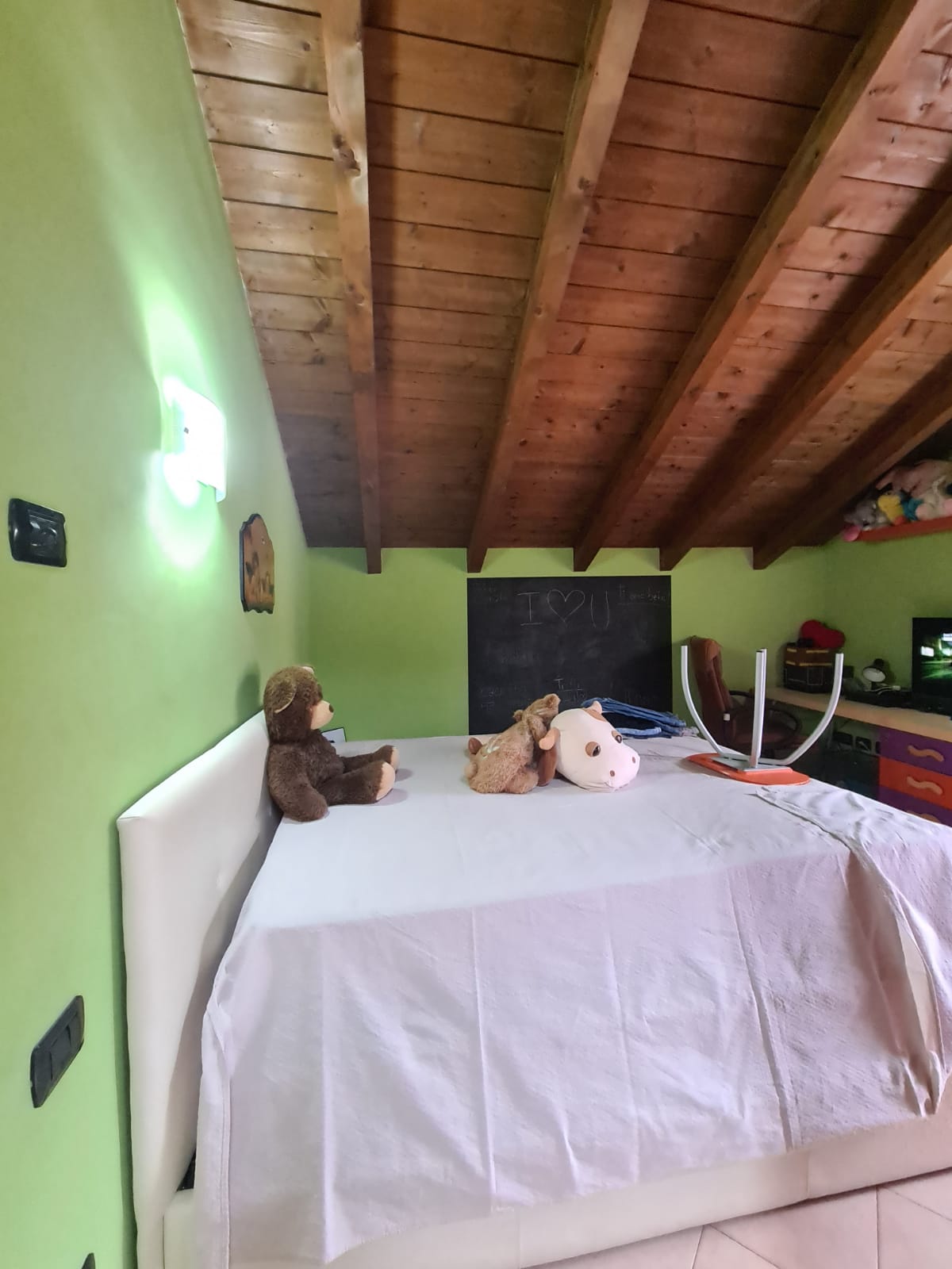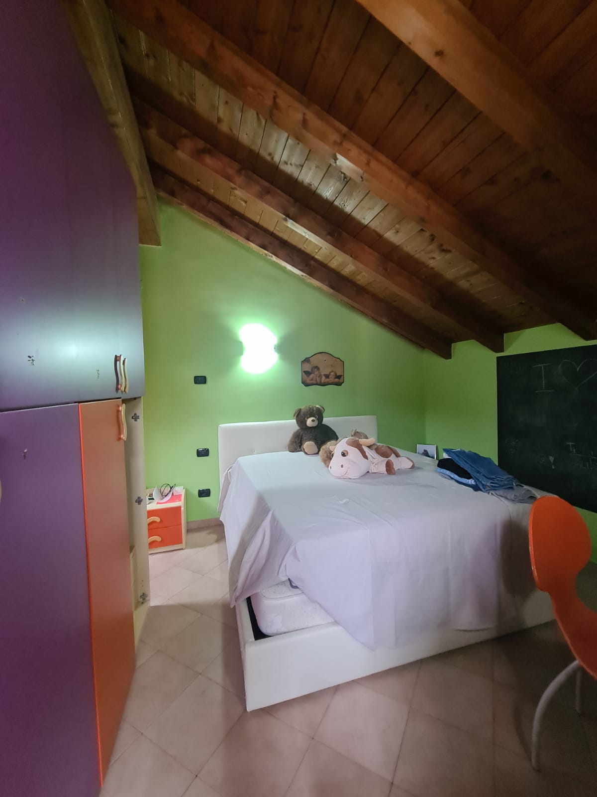 L'appartamento che si sviluppa su due livelli ed ha accesso indipendente da un ampio giardino terrazzato (attrezzato con ricovero attrezzi ed angolo barbecue) e dal quale tramite scala esterna in muratura si sale al primo piano, è composto da grande zona giorno con angolo cottura, camera singola, ripostiglio (alloggio lavatrici) e servizi (ampi con doccia e finestra); al secondo piano (al quale si accede tramite caratteristica scala in legno) da disimpegno, due grandi camere (la più ampia affacciata su panoramica terrazza al piano di 15 mq.) e secondo bagno (con doccia e finestra velux).