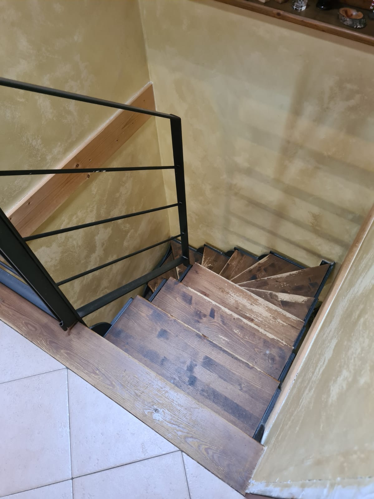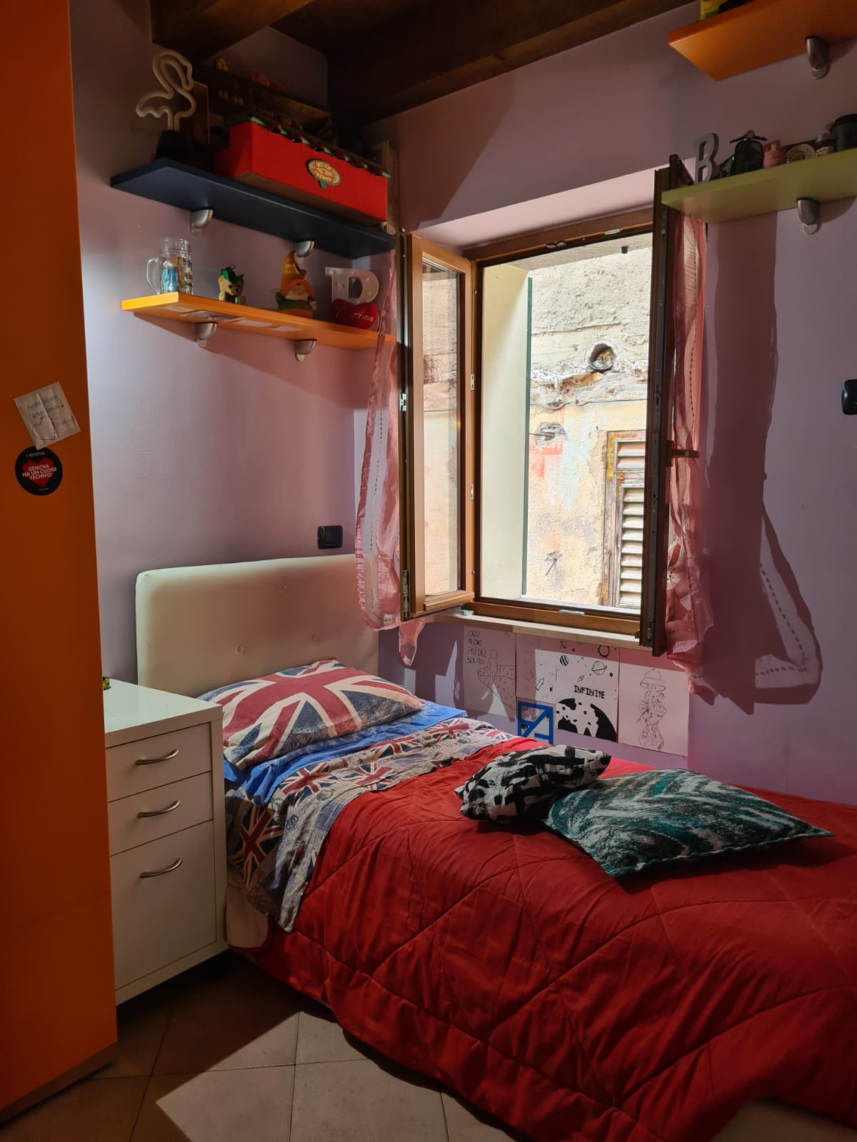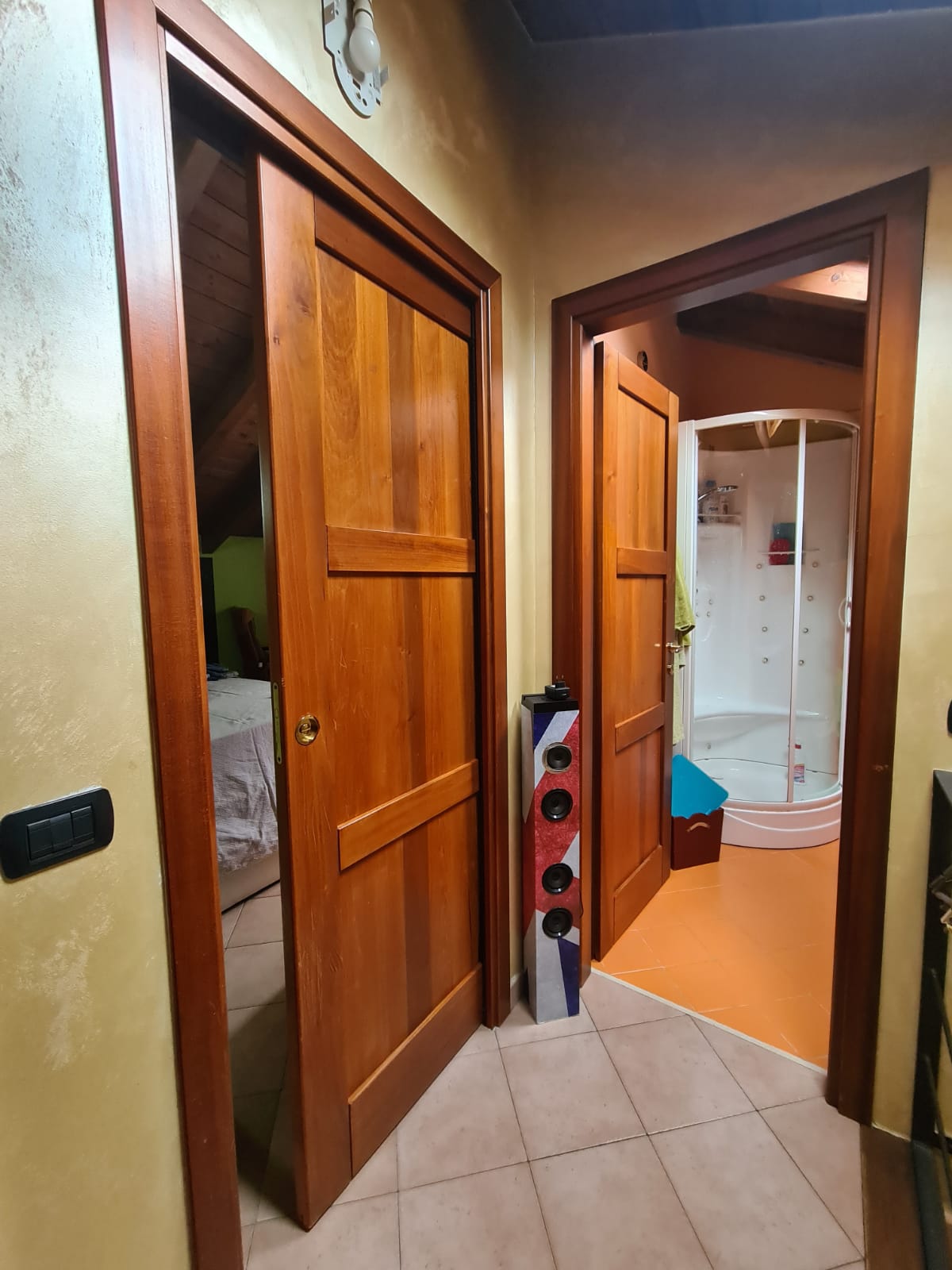 L'appartamento che si sviluppa su due livelli ed ha accesso indipendente da un ampio giardino terrazzato (attrezzato con ricovero attrezzi ed angolo barbecue) e dal quale tramite scala esterna in muratura si sale al primo piano, è composto da grande zona giorno con angolo cottura, camera singola, ripostiglio (alloggio lavatrici) e servizi (ampi con doccia e finestra); al secondo piano (al quale si accede tramite caratteristica scala in legno) da disimpegno, due grandi camere (la più ampia affacciata su panoramica terrazza al piano di 15 mq.) e secondo bagno (con doccia e finestra velux).
