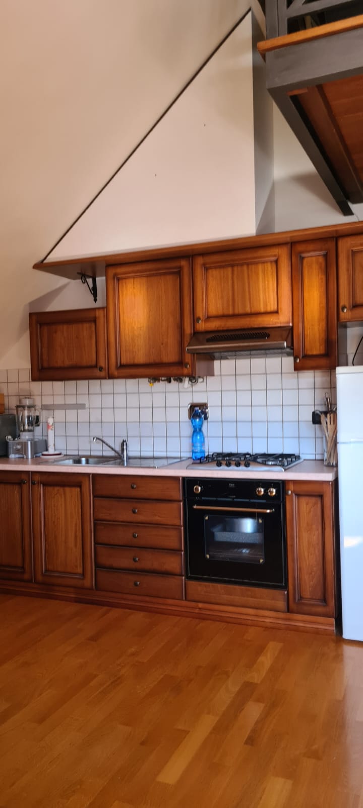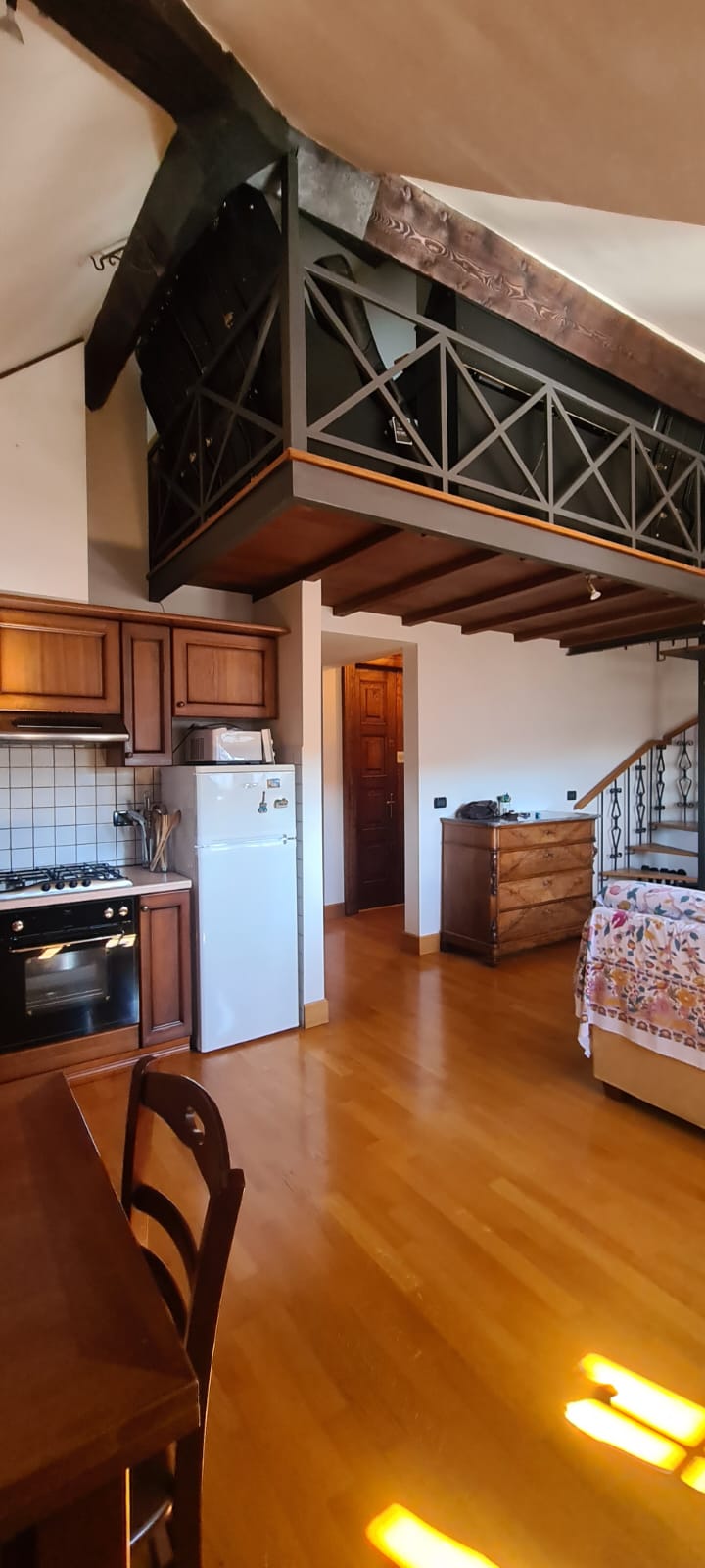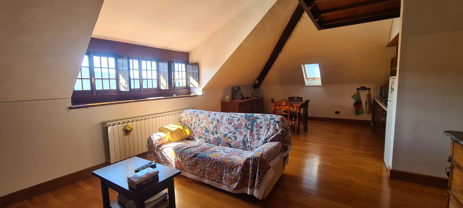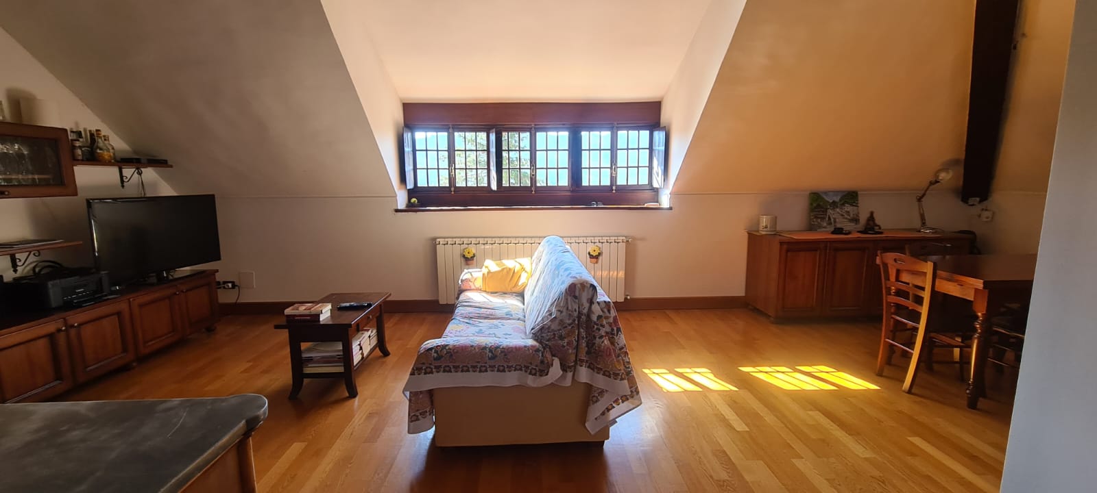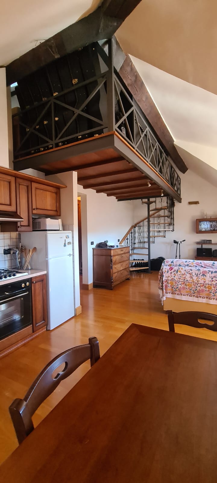 caratteristico appartamento mansardato posto al terzo ed ultimo piano (la villa è dotata di ascensore) composto da una grande zona giorno con cucina a vista, disimpegno, due camere e servizi (vasca e finestra) oltre a locale soppalcato (con accesso dalla zona giorno tramite scala in legno e ferro) ad uso studio o zona notte con secondo locale servizi.