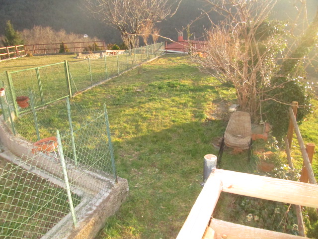 Al primo piano, (con accesso da ingresso dal terrazzo o da scala a chiocciola dalla taverna) cucina abitabile (portoncino, due finestre, soffitti in legno a vista) affacciata su gradevole terrazzo di 25 mq. esposto a mezzogiorno e sulla vallata. Il terrazzo comunica senza soluzione di continuità con il giardino di circa 150 mq. tutto in piano e recintato, perfettamente mantenuto e con la stessa splendida esposizione.