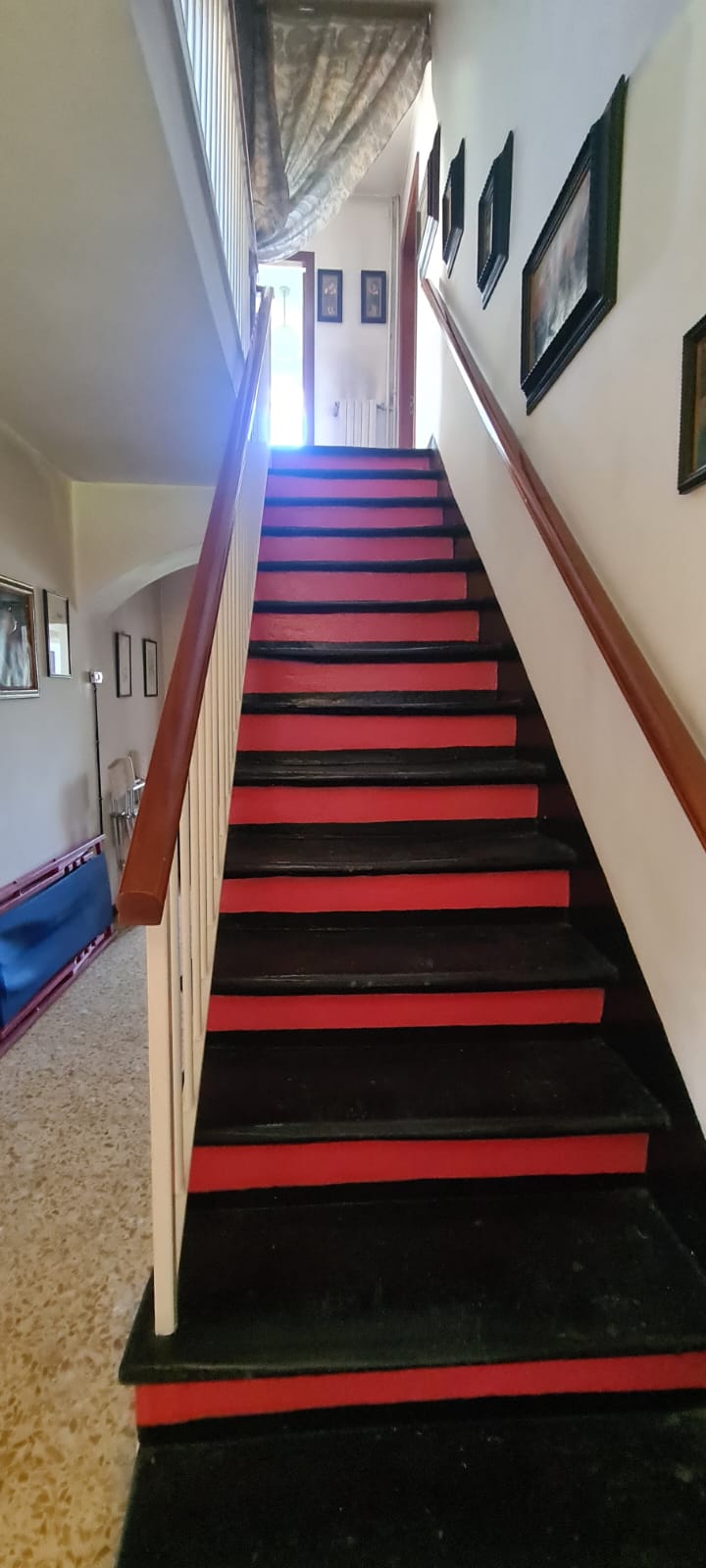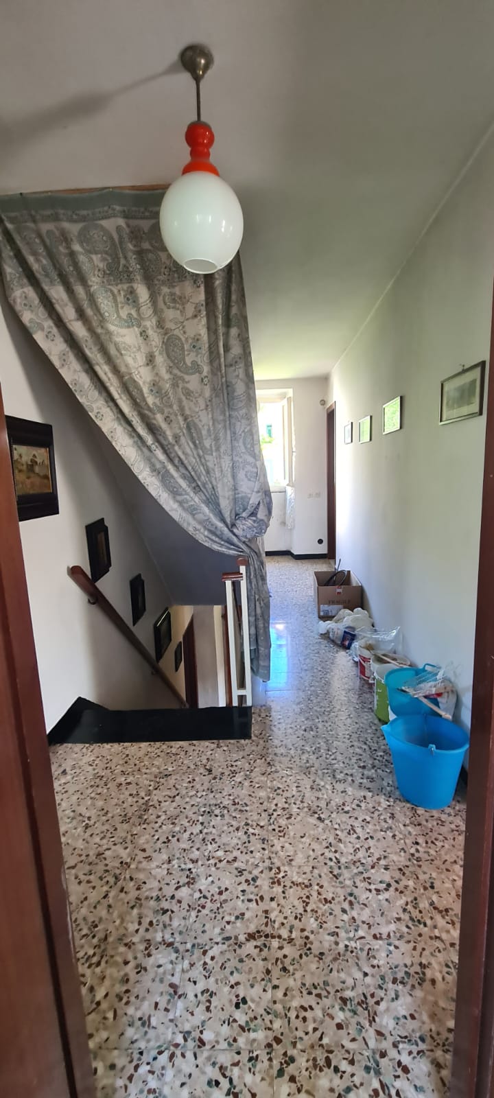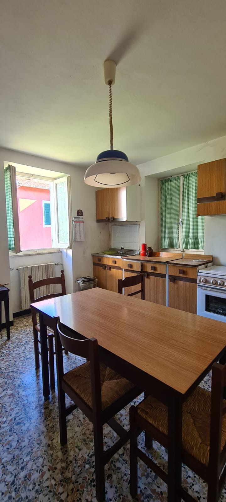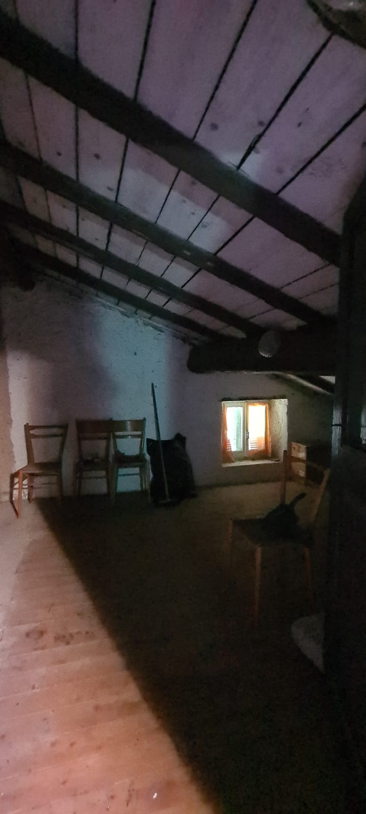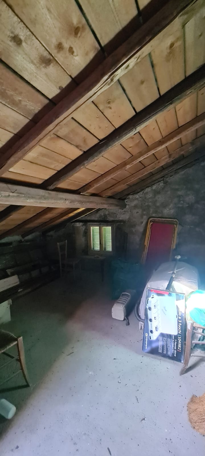 al piano terreno da ingresso, grande cucina, soggiorno (a servizio della stessa), altri due grandi locali a giorno (eventuali camere), disimpegno e servizi (con vasca e finestra); al primo piano (al quale si accede da comoda scala interna) da disimpegno, quattro camere (di cui una originariamente utilizzata come seconda cucina a servizio del piano), e secondo bagno (gemello del primo, con vasca e finestra). Al piano sottotetto, con comodo accesso da scala, da tre grandi locali di sgombero (tutti adeguatamente finestrati e recuperabili eventualmente a mansarda vivibile).