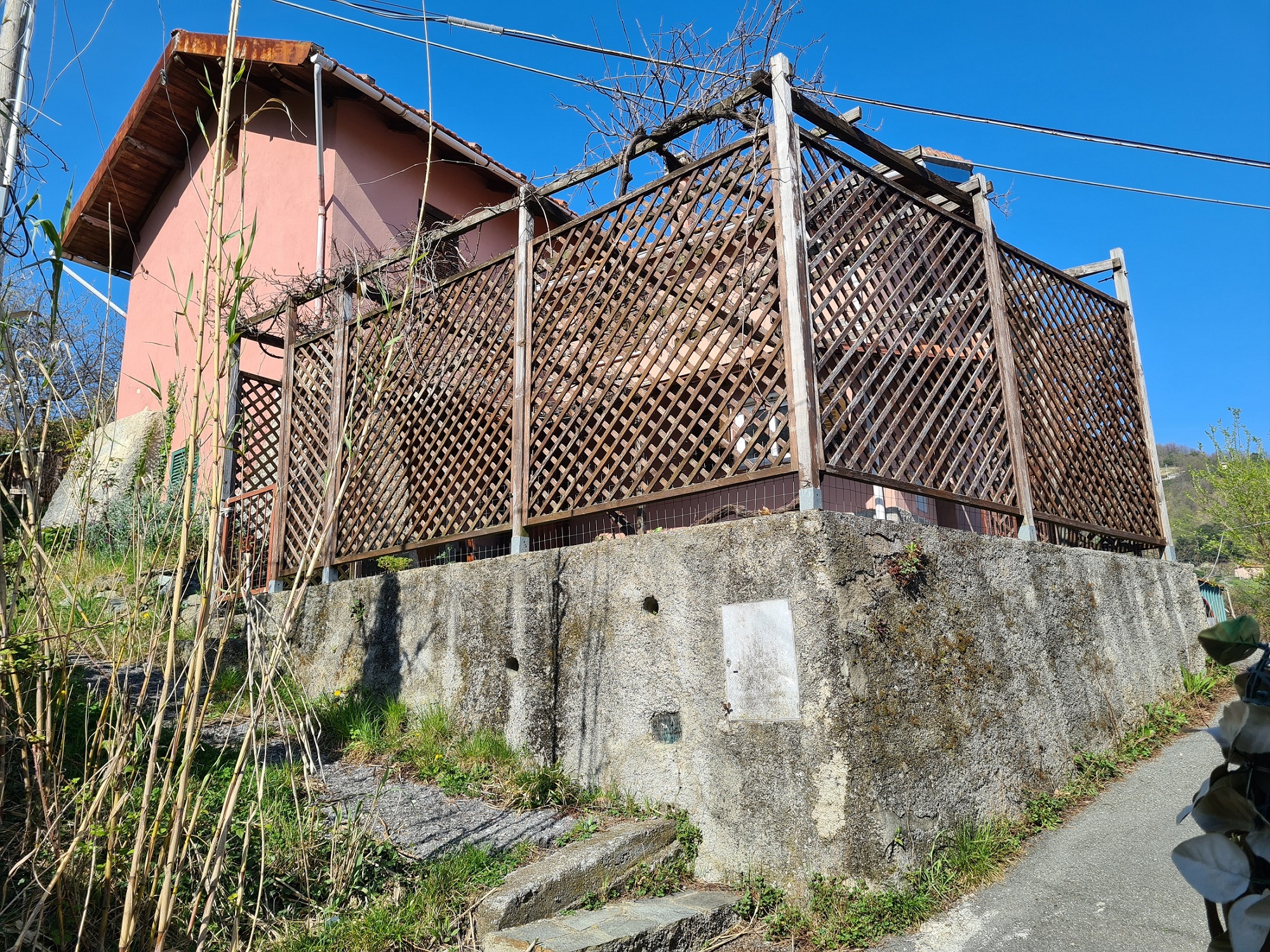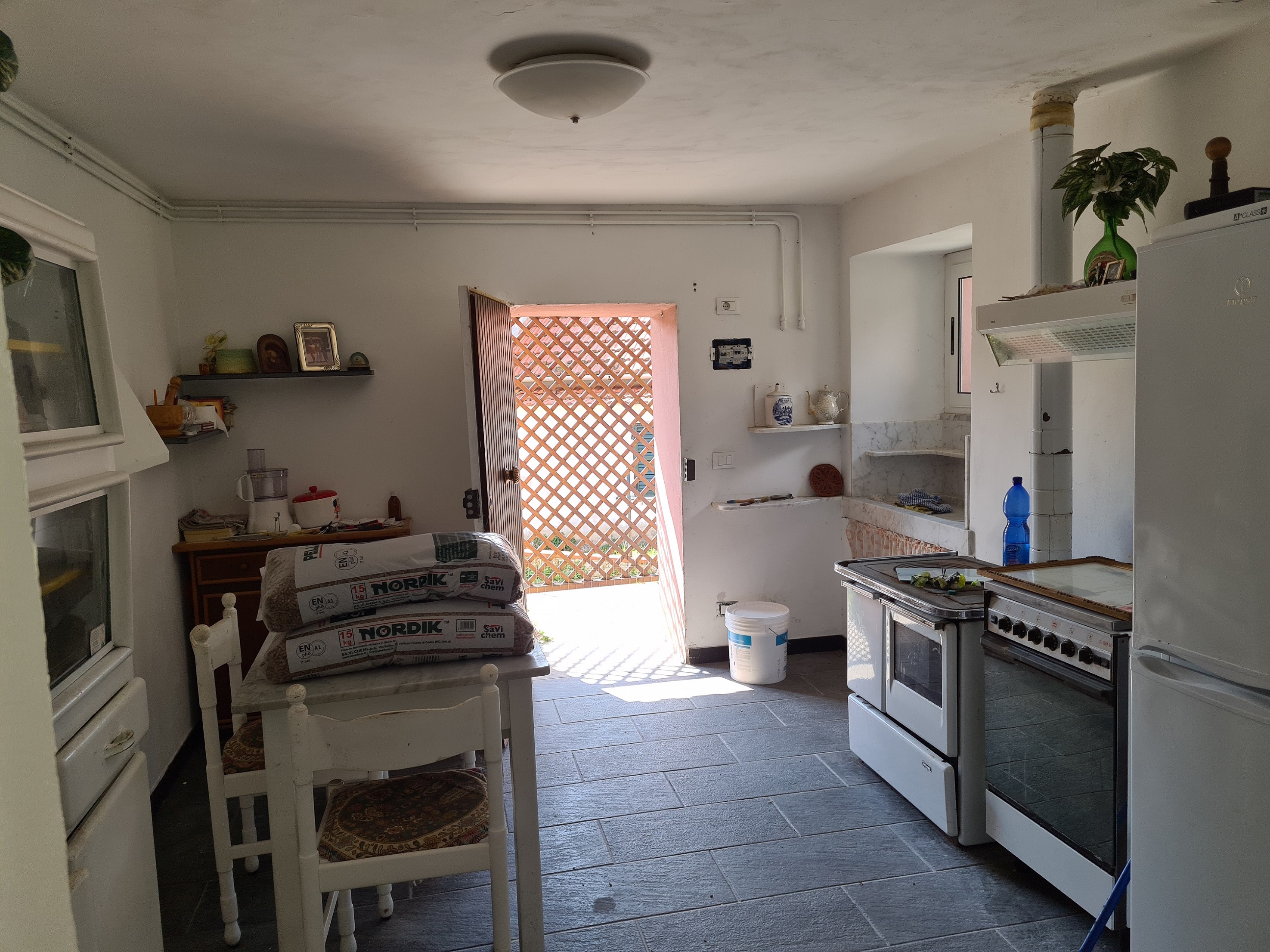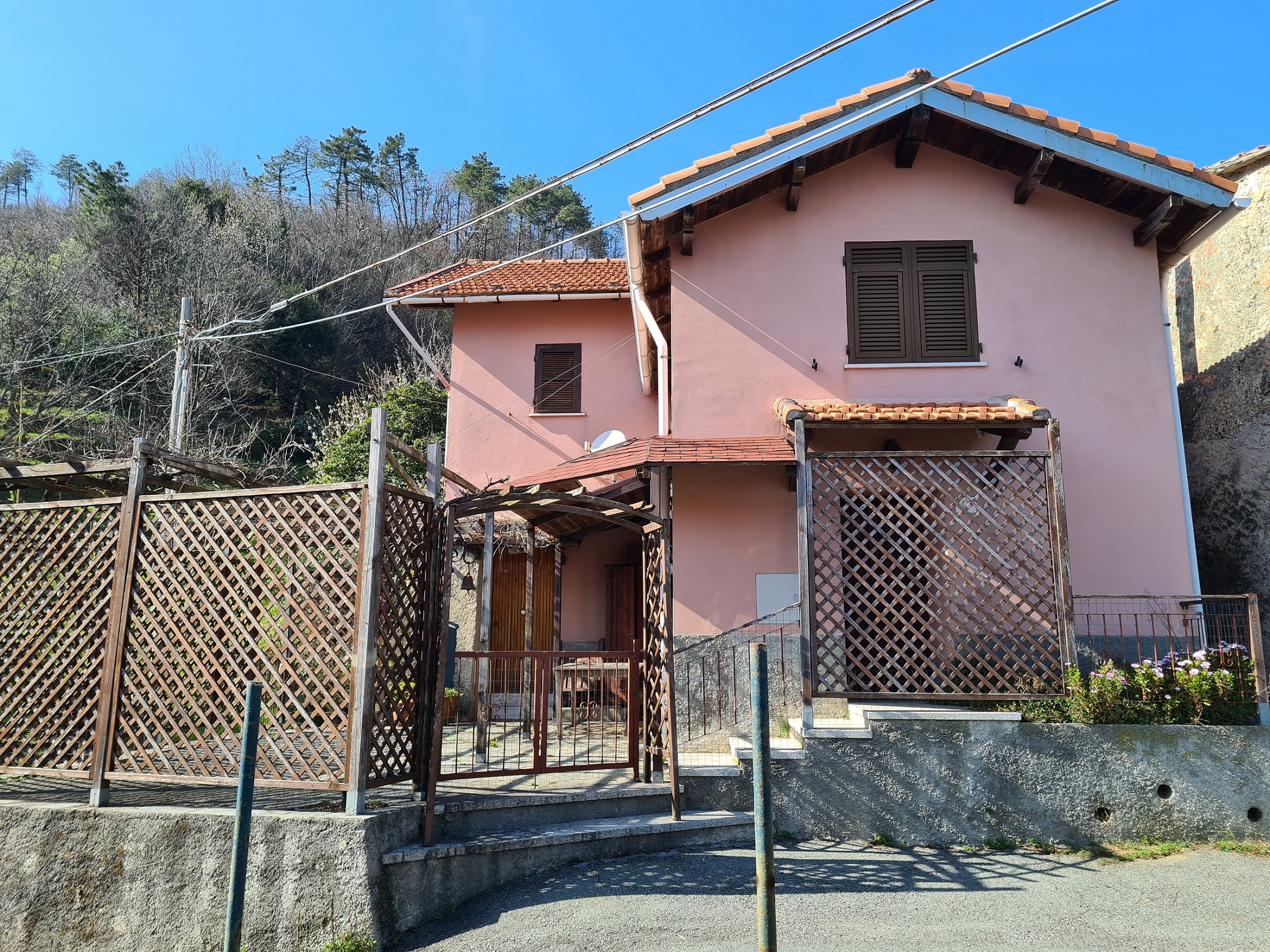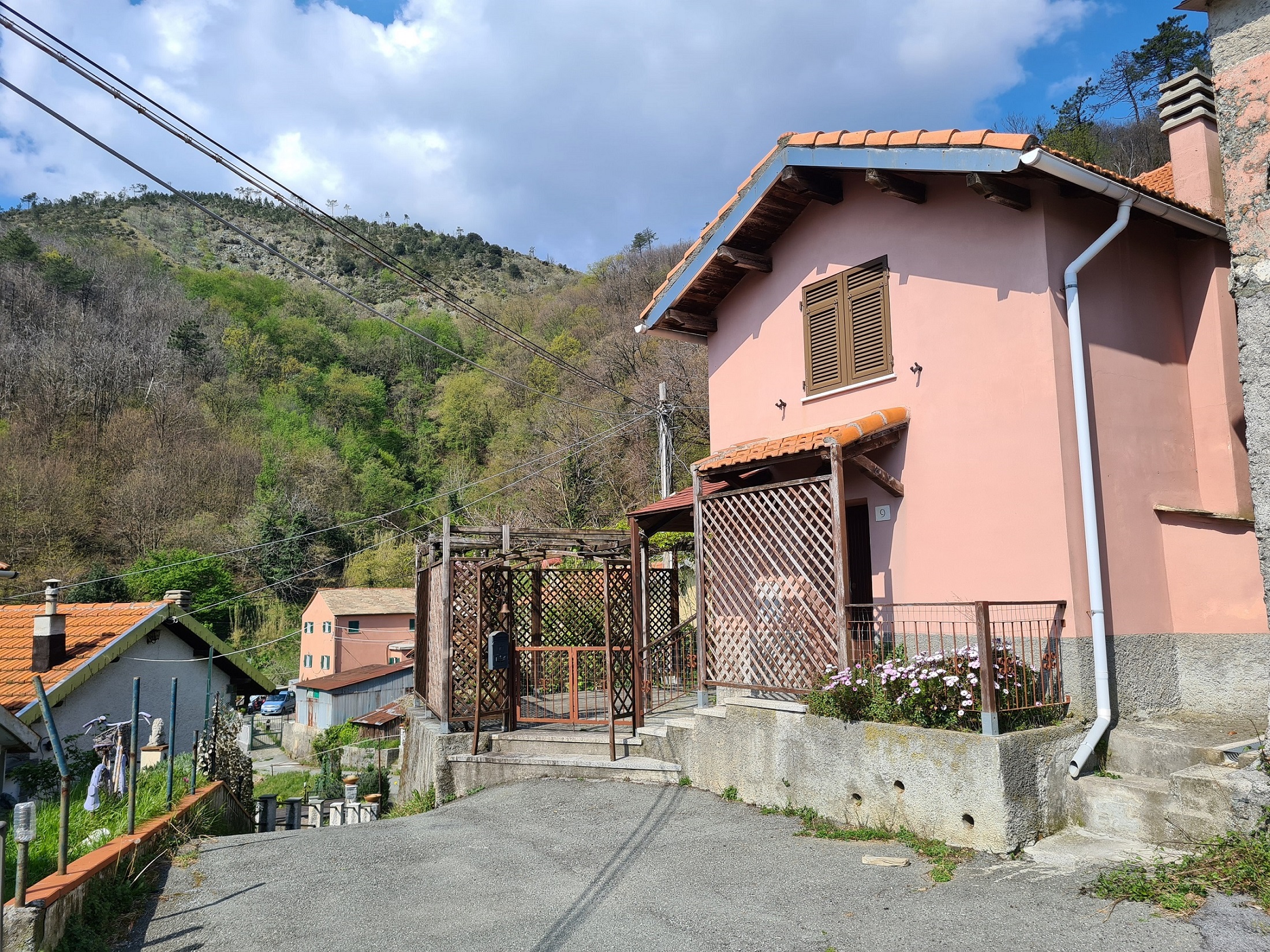 La casa è composta al piano terreno dal giardino terrazzato con pergolato e da cucina abitabile (davvero caratteristica, lavandino in marmo alla genovese, forno in muratura), soggiorno (con caminetto), servizi (doccia e finestra) e camera singola o studio; al piano superiore (al quale si accede tramite scala interna in legno) da piccolo disimpegno, due camere e terzo locale mansardato ampio e molto luminoso, con caratteristici soffitti con travi a vista) uso ulteriore zona notte o altro.